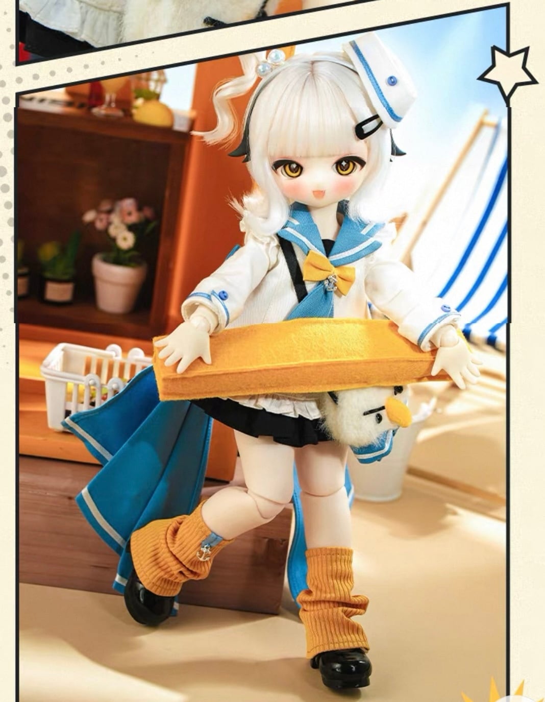 ◆TINY FOX◆ MJDドール フルセット 「ポテト配達人 セイラー」 ◆納期予定◆ 2026年9月以降を予定 (メーカーから情報があり次第、随時更新いたします) ゚・*:.。..。.:*・゚ ゚・*:.。..。.:*・゚ ゚・*:.。..。.:*・゚゚・*:.。..。.:*・゚ ◆◆◆DOLL’S STORY◆◆◆ フォックスタウンで、妙なウワサが広まっている・・・ ウワサは、とても、短くて たったこれだけの一言でした 「港で、ポテトを食べないで !」 一方、ここの住人たちは 多少なりとも 風変りなものばかり。 理屈を通せば、誰もがびくついてしまうような 目立つ存在がいるわけじゃなし・・・ 奇妙なルールらしきものさえあるのです 「・・・冗談じゃない! 買ったばかりのXブランドのゴールドバッグを持って ふ頭を通りたかっただけなのに、 一瞬でバッグに大きな穴があいていた! 中身のフライドポテトが、全部なくなっていたんだ・・・!!!」 被害者の一人が、特大のメガネをなおしながら、憤然と訴えた。 ポテト泥棒か何か みたいですね。 ほっておいても 大きな問題、ないみたいですね?? 「フン、この揚げたてのポテト、少しでも置いとくと おいしくなくなっちゃうの。 袋に入れたまんまにしておくなんて、モッタイナイ! ポテト配達員のワタシが、こんな目にあうわけ、ないじゃない!」 暗闇の中、少女はこぶしをギュッとにぎりしめた。 「この町のフライドポテトは、ワタシが守る!!!」 ˚₊‧꒰ა ☆ ໒꒱ ‧₊˚ ˚₊‧꒰ა ☆ ໒꒱ ‧₊˚ 《フルセット内容》 ドール本体(1/6天使ボディ)、顔メイク、ウィッグ、衣装セット、アイ、ウイッグすべりどめテープ×2、アイパテ、ミニヘアブラシ、やすりシート 《セイラー フルセット専用特典》 ◆フルセットご購入で、「はい、ポテト!(撮影小物)」をプレゼント! 《オプション品》(追加購入可能オリジナルオプション) ●1/6サイズ 「選べるお靴 ①~⑧」 ●ヘッド交換用フック(ちょうどよい力で、ヘッド交換が楽にできます) ●シリコンキャップ(ウイッグのずれ防止・前髪位置の調整に便利) ●ドールバッグ「アーガイル」(底板を外して、ドールを隠すこともできる、リュックや肩掛けも可能なクラシカルデザインバッグ) ●色移り防止スーツ(濃い色の衣装から、ドールボディへの「色移り」を防ぐためのドール用全身スーツ) 《衣装内容》 カモメさんバッグ・セーラーカラーAラインスカート・白黒カラーブロックスカート・ ビッグリボン・白カモメのショートソックス・あたたかいストライプレギンス・セーラーハット・黒ぱっちんどめ 《付属品・パーツ》 カモメのカチューシャ ※EDEN限定オプション ●ドールバッグ(小片糖の原創工作室「アーガイル」1/6サイズ) ●Tiny Fox 色移り防止スーツ(メーカー欠品する場合もありますので同時購入がおすすめです⭐) ●ドールスタンド(潮玩大模王◆1/6メタルドールスタンド) ●ヘッド外しフック 《ウイッグ》 「かわいい♪ サイドポニー」 《アイ》 「スターキャンディ」 14mm 《フェイスメイク名》 「埠頭に行って、フライドポテトを買って」 《メイクアップデザイナー》 @青芸 《ヘッド》 C-16 《素材》PVC+ABS ※MJDドール:材質はPVC(ポリ塩化ビニル)、ボディパーツは嵌合式・可動式で組み立てられています。 (いわゆるキャストドールのように、ボディの中にゴムが通っている仕組みではありません。) しっかりとしたつくりで、自立もしやすいので、ドール初めての方にも安心♪ お取扱いや、ポージングもしやすいボディ(ドール)です。 身長も小さめなので、バスケットや、バッグに入って 持ち運びや、お出かけにも◎ アイは付属のアイパテを使って、オーナー様にて取り付けていただきます。 アイをつける際や、衣装の着せ付け時、デザインによってはヘッドを取り外す必要があります。 ヘッド外しにはヘッドを開けて、中のフックをひっぱり、90度回転させて外しますが ひっぱる際の力の加減があり、専用器具(ヘッド交換用フック)のご使用がおススメです。 《ボディ》  ※新しいコーティング技術による新1/6ボディ採用 (従来のボディよりも色移りしにくく改良されております。) 《スキンカラー》 白巧 ホワイトチョコ  身長:27.5cm(ヘッド含む)  身長:22.5cm(ヘッド含まない)  頭囲:22.5cm  首周り:5cm  肩幅:4cm  バスト:10.6cm  ウエスト:10cm  ヒップ:16cm  腕長:7.5cm  レッグ長さ:13cm  太もも周り:9.5cm  足長:4cm ※価格に国際送料・消費税を含みます。(別途送料はかかりません。) ※未成年のお客様は、備考欄にその旨ご記入ください。 (保護者様の同意書のご提出をお願いいたします。) ※こちらの商品は、中国からのお取り寄せ品となります。(国際便でのお届け・局留めと日時指定は不可) お届け時にご不明な点がございましたら、お受け取り後1週間以内に、お写真等添えて当店までご連絡くださいませ。メーカーへの交渉等を担当させていただきます。 ※ドールはブリスターパック梱包のうえ、薄めのメーカーオリジナルデザインの紙箱で梱包されており、こちらをさらに段ボールで梱包の